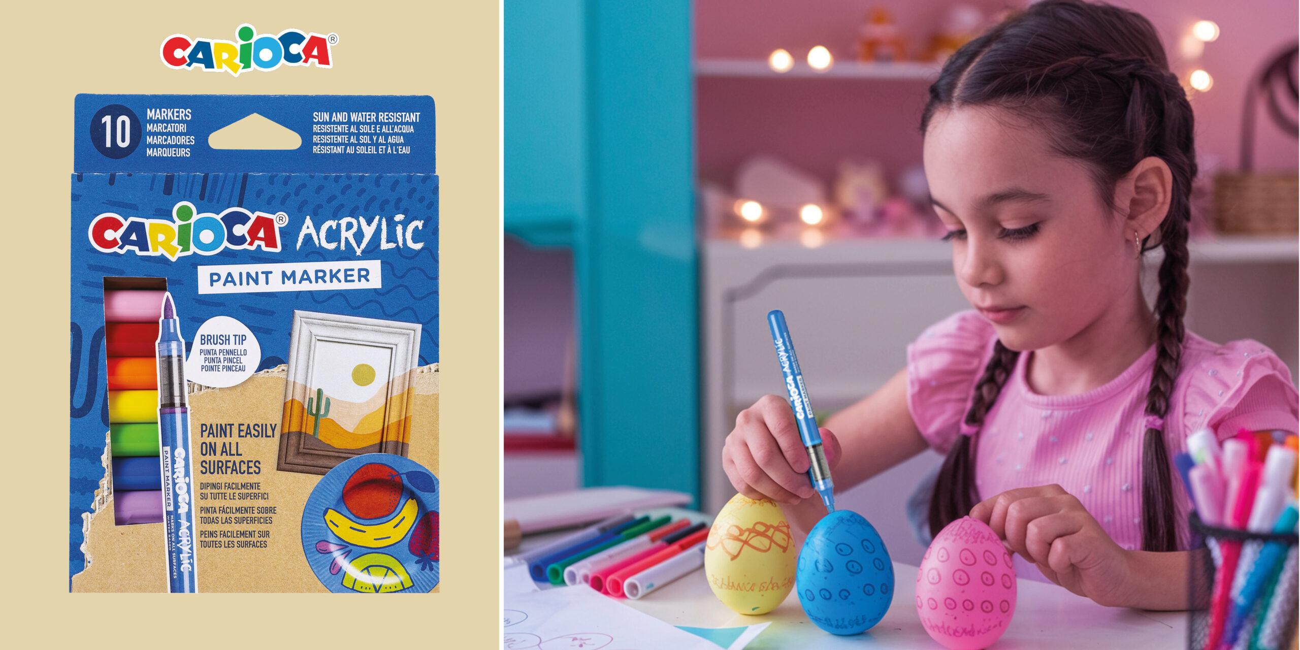 Pasqua, con l’avvicinarsi della primavera, è sinonimo di creatività e colore: decorare uova, centrotavola e lavoretti con CARIOCA diventa un gioco da ragazzi, con risultati sorprendenti su qualsiasi superficie. CARIOCA, brand simbolo della creatività per tutti, propone il nuovo Acrylic Paint Marker, il marcatore acrilico ideale per chi ama il fai da te e l’hobbistica. Facile da usare e incredibilmente versatile, permette di dipingere con precisione su qualsiasi superficie: legno, ceramica, vetro, cartoncino e molto altro. Diverso dai tradizionali marker acrilici, il nuovo Acrylic Paint Marker di CARIOCA offre un controllo superiore del colore e una punta morbida che permette di lavorare anche su superfici irregolari. L’inchiostro è coprente, resistente all’acqua e perfetto per creare decorazioni vivaci sia su superfici chiare sia scure. Quest’anno, allora, decorare la Pasqua è ancora più semplice e divertente: con l’Acrylic Paint Marker di CARIOCA, uova, segnaposti, centrotavola e biglietti augurali prendono vita con un bel tocco di colore. Grazie al meccanismo free ink, il marcatore è sempre pronto all’uso, senza bisogno di essere attivato. Disponibile in 18 colori brillanti, l’Acrylic Paint Marker di CARIOCA è pensato per soddisfare le esigenze di artisti esperti e appassionati di ogni livello. Le confezioni disponibili da 2, 5, 10 e 18 colori si possono trovare in cartoleria, sul sito carioca.com e su Amazon. Età: dai 7 anni.
