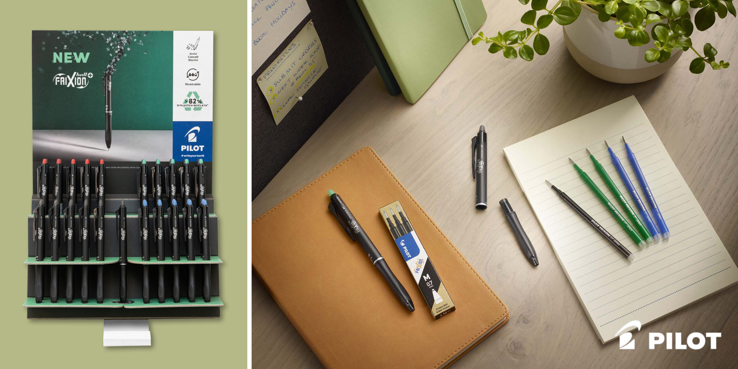 La capacità di adattarsi alle sfide rinnovandosi costantemente grazie alla continua ricerca nei prodotti, ha permesso a PILOT di distinguersi e di conquistare la fiducia dei consumatori di tutto mondo. Con la Frixion Ball+, penna cancellabile a inchiostro termosensibile, realizzata con una percentuale di plastica riciclata maggiore del 90%, PILOT si posiziona ancora una volta come attore innovativo e sostenibile nel mercato degli strumenti da scrittura; la tradizionale punta 0,7 e l’impugnatura grip ergonomica certificata IGR offrono un utilizzo confortevole, accompagnate da un elegante design nero opaco. Ricaricabile con gli appositi refill, è disponibile con inchiostro di colore nero, blu, rosso e verde.